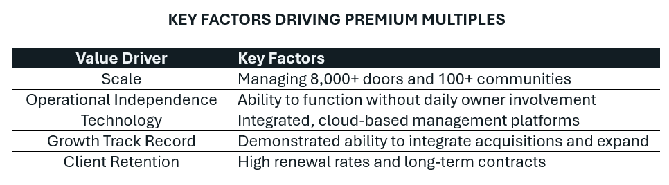 Scalability. Multi-office operations managing thousands of doors demonstrate resilience and efficiency, making them prime targets for strategic buyers.